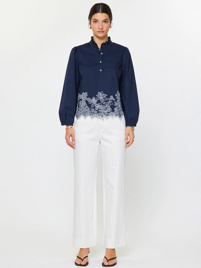 This versatile cotton poplin blouse brings timeless charm to your wardrobe. The ruffled stand collar, graceful puff sleeves, and intricate floral embroidery at the hem create an instantly polished look. Its relaxed fit ensures all-day comfort whether you're running errands or heading out for dinner. Machine wash on gentle cycle in cold water to preserve the beautiful details.