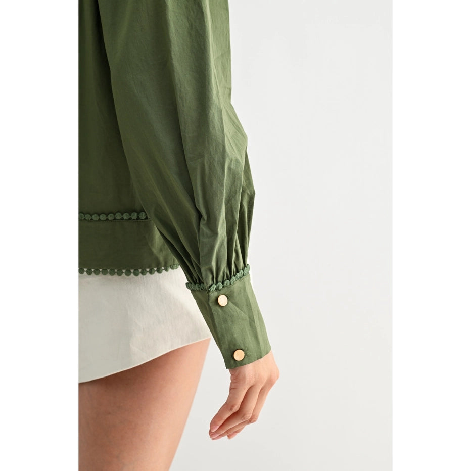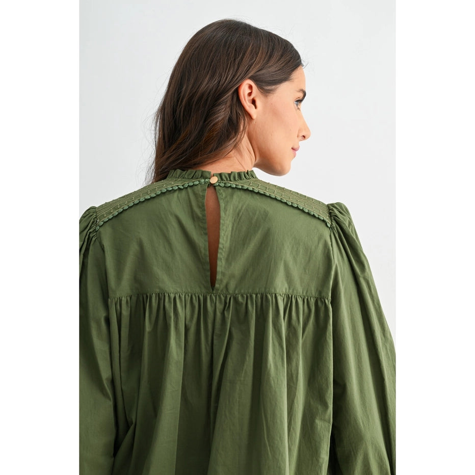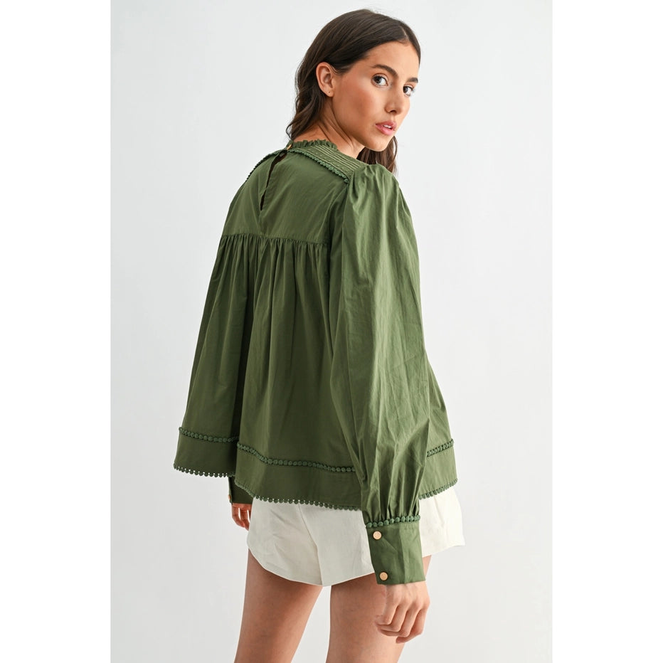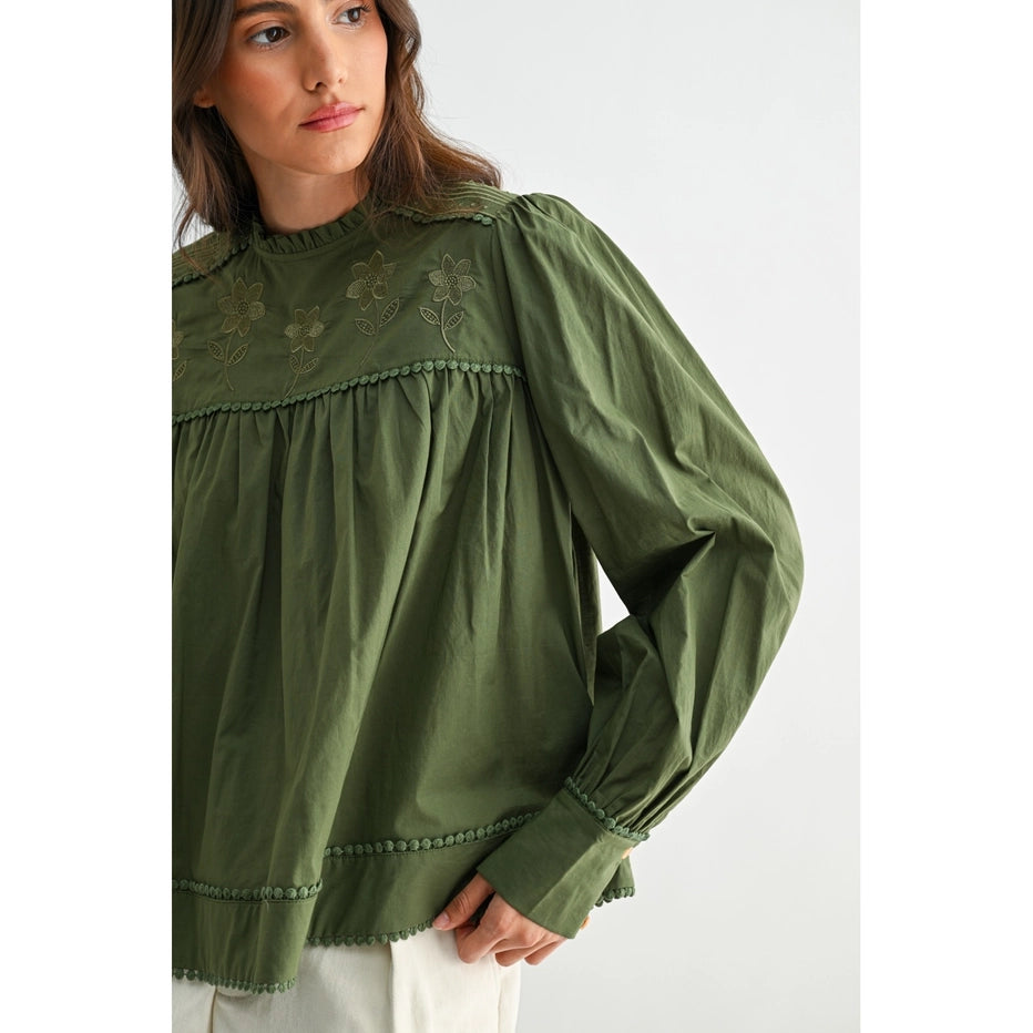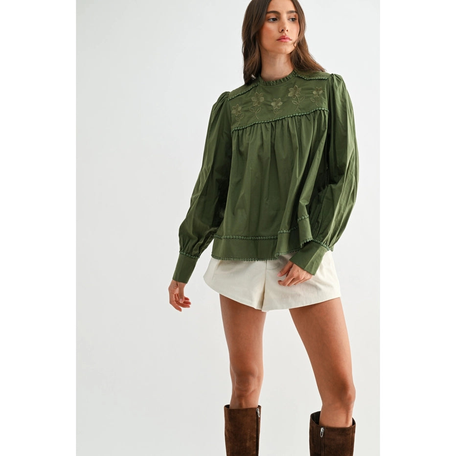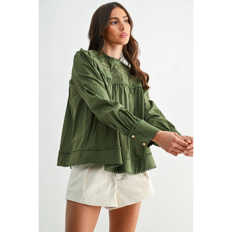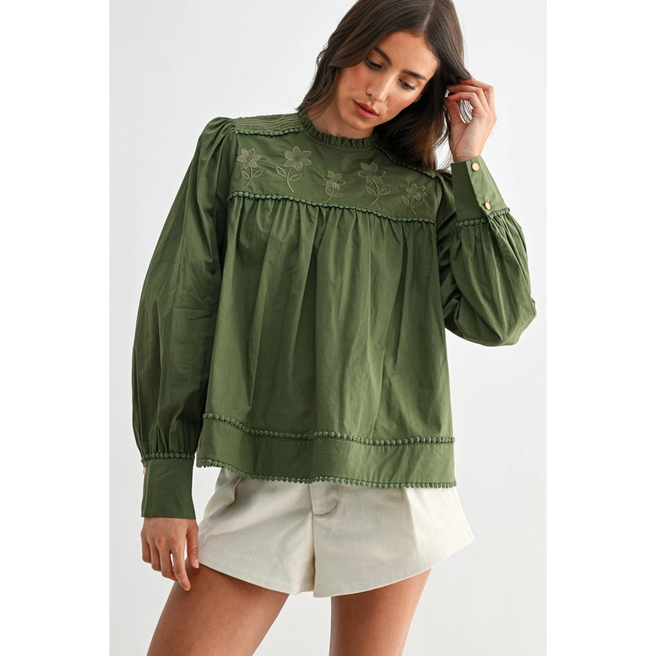 This romantic olive blouse captures effortless charm with hand-embroidered florals and whimsical pom-pom trim details. The soft, breathable 100% cotton construction drapes beautifully with voluminous puff sleeves and a relaxed silhouette that flatters every frame. Perfect for adding a touch of vintage-inspired elegance to your everyday style.