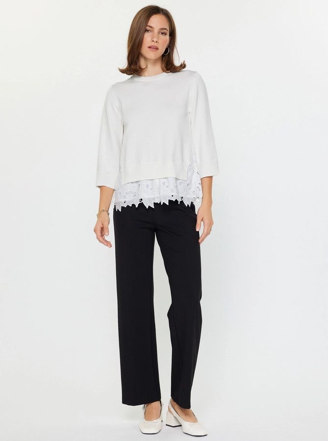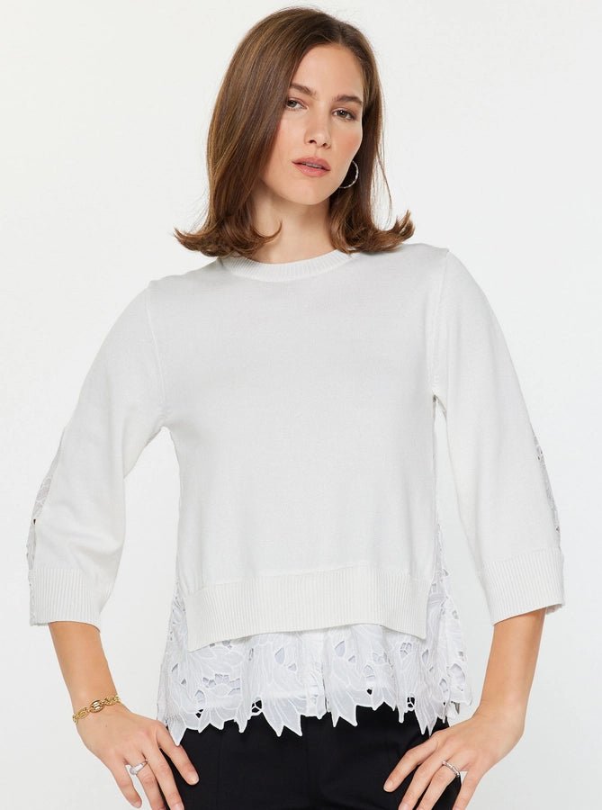 Cozy meets chic with this mixed media sweater top! The soft modal-cotton blend features a classic sweater front paired with delicate lace contrast detailing, complete with a lace hem for extra flair. Round neckline with ribbed trim, 3/4 sleeves, and an effortless silhouette perfect for fall and winter layering. Hand wash cold and lay flat to dry for best results.