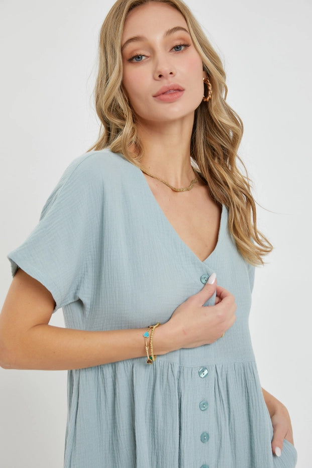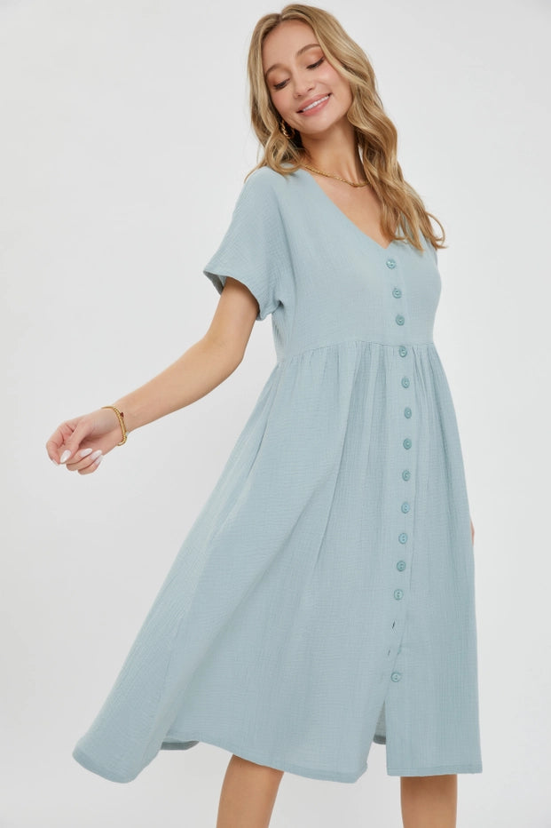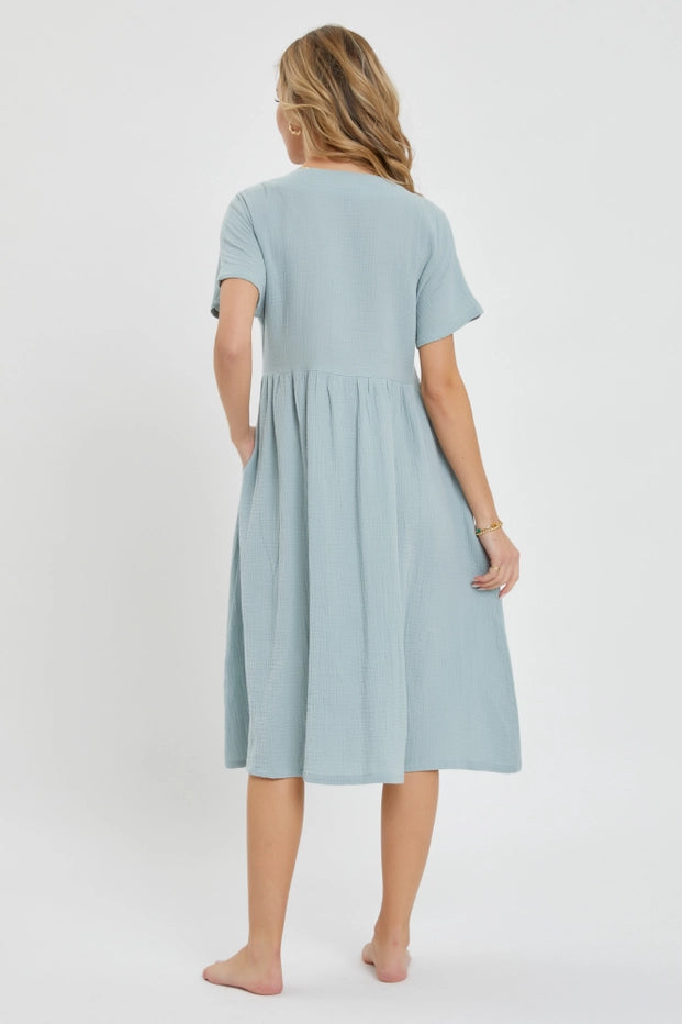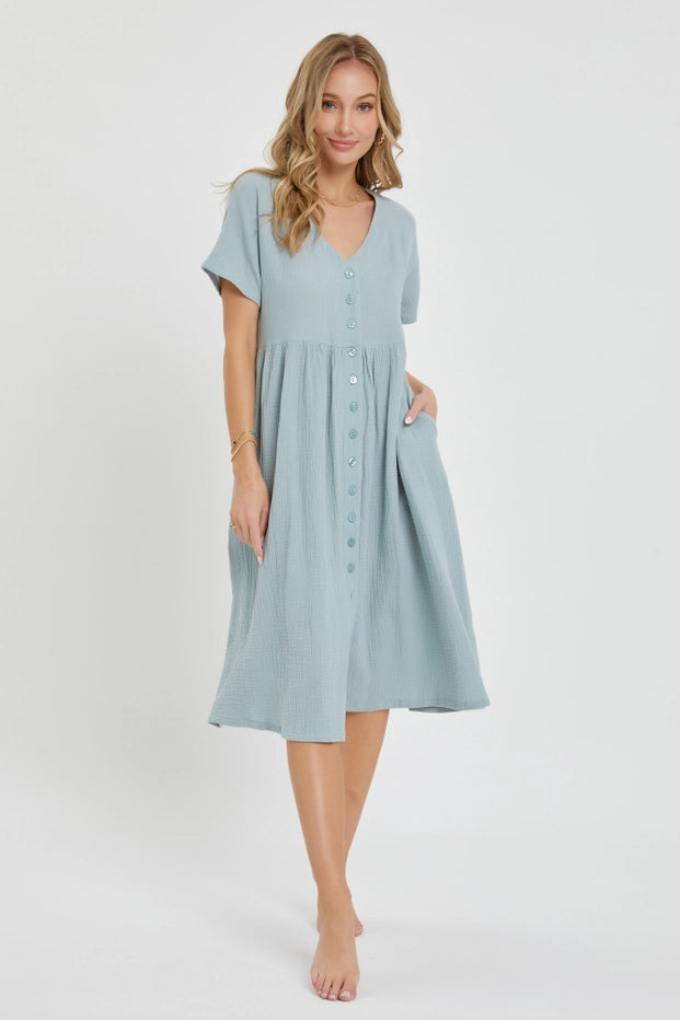 Meet your new wardrobe staple—a breezy cotton gauze midi dress that takes you from casual outings to relaxed gatherings with ease. The soft, double-layered fabric breathes beautifully, while the V-neck, short sleeves, and hidden side pockets deliver both comfort and functionality. Button-front styling and a relaxed fit make getting dressed effortless. Your spring and summer essential awaits.