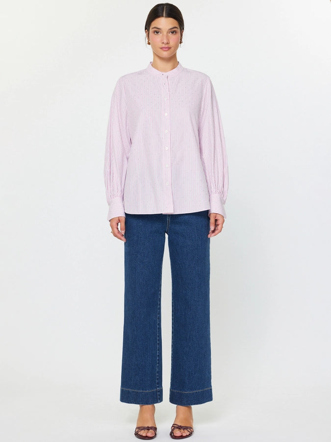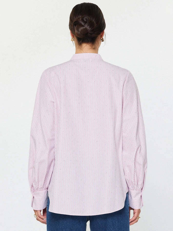 This elegant blouse combines timeless style with eye-catching sparkle. The pinstripe pattern features delicate rhinestone accents that catch the light beautifully, while the mandarin collar and button-down front create a polished, sophisticated look. Long sleeves with wide cuffs and a relaxed fit offer comfort without sacrificing style. Perfect for spring and summer occasions, the poly-cotton blend is easy to care for with gentle machine washing. Effortlessly chic and versatile.